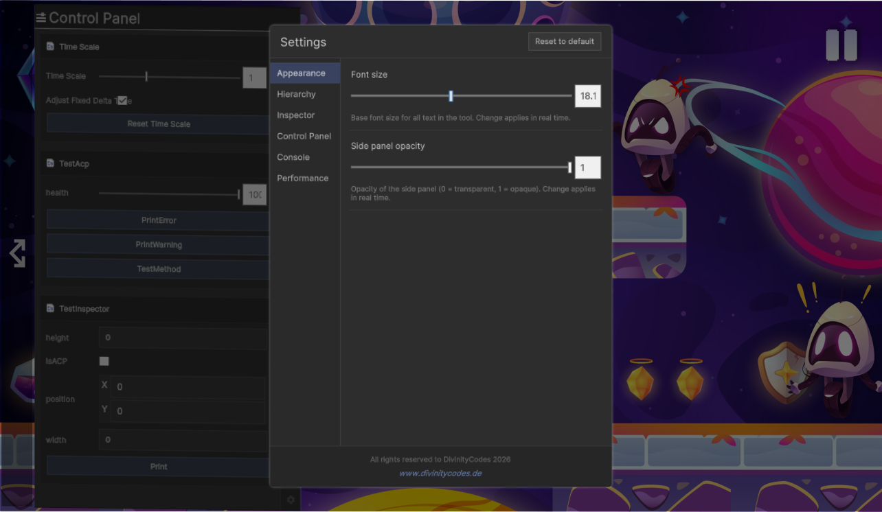 UI Opacity: Control the transparency of the side panel to maintain visibility of your game world while debugging.