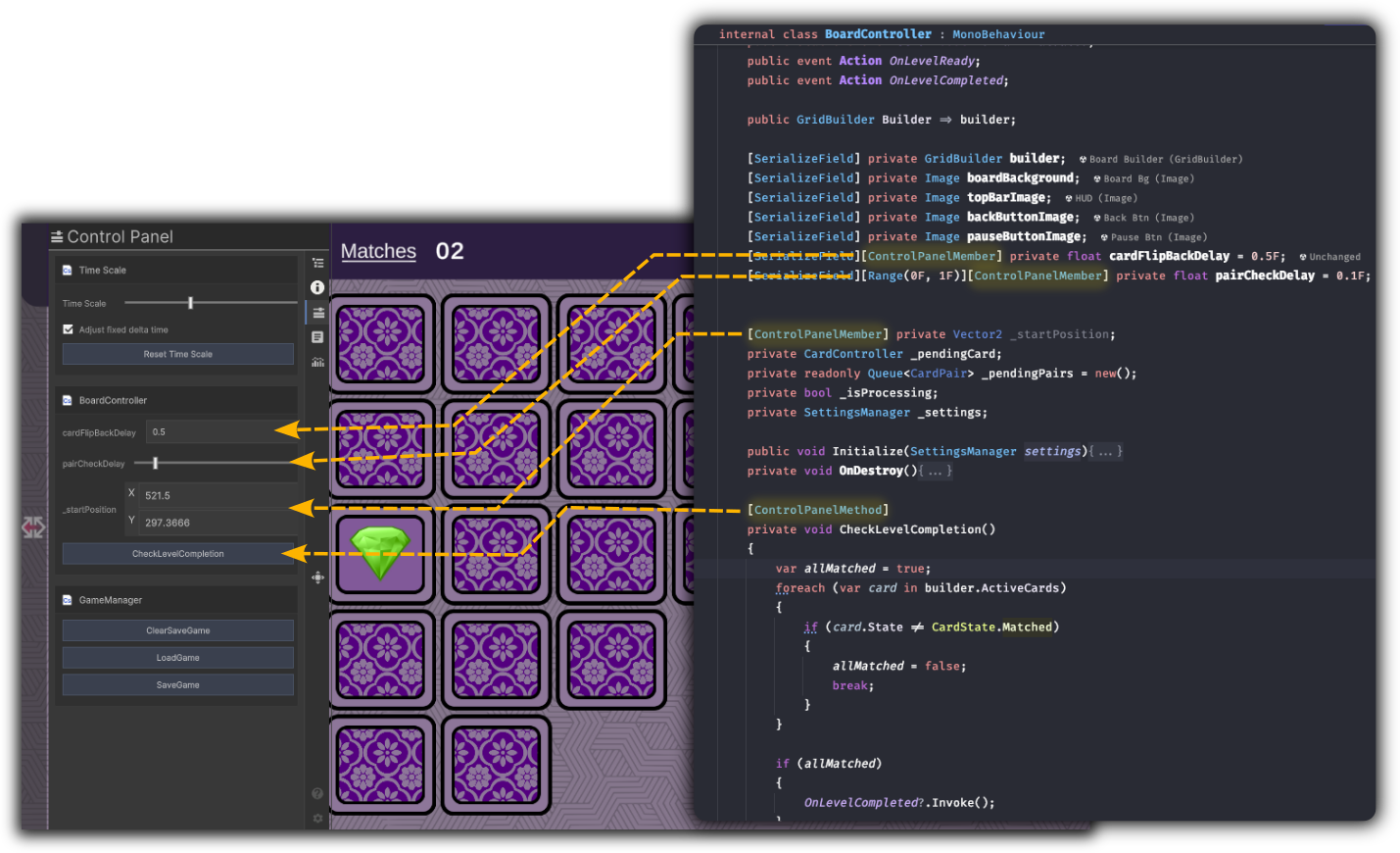 [ControlPanelCategory("CategoryName")]on the class (optional) - groups its entries under that name.[ControlPanelMember("Display Name", order)]on fields or properties - int, float, bool, string, enum, Vector2/3/4. Use[Range(min, max)]for numeric limits.[ControlPanelMethod("Button Label", order)]on parameterless methods — shown as a button.- Ensure the GameObject with that component is active and in a loaded scene.